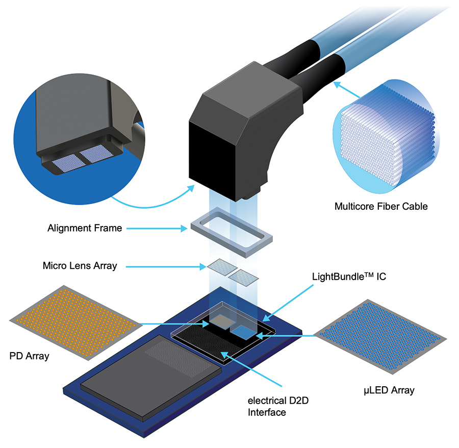 While electrical interconnects work well over short distances of a few millimeters, they face fundamental limits in terms of reach, size and power efficiency, especially at higher data rates and longer distances. Avicena’s LightBundle™ interconnects use arrays of microLEDs connected via multi-core fiber bundles to Photo Detectors on CMOS ICs. This enables ultra-low power links of < 1 pJ/bit with over 10 meters reach.
